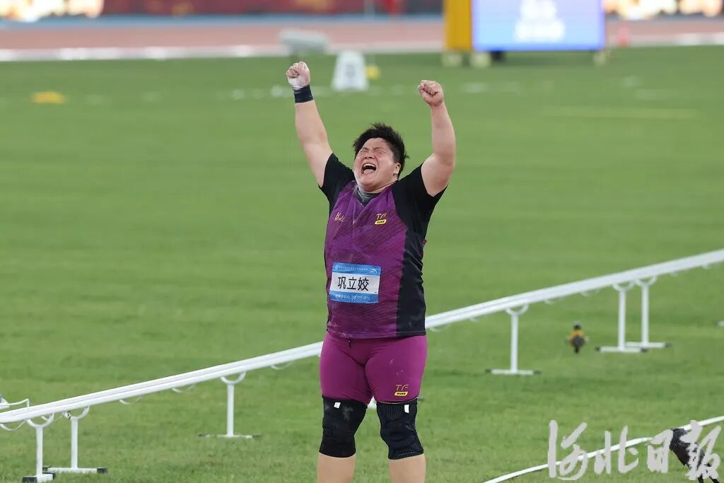 11月16日,河北运动员巩立姣庆祝胜利。河北日报记者 耿辉摄