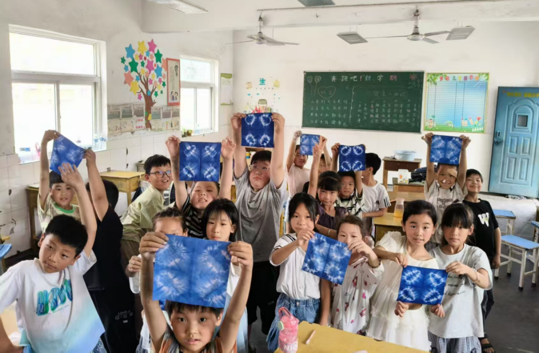 如今,非遗课程已成为孩子们每周翘首以盼的“特别时光”,激发了他们对传统技艺的浓厚兴趣与无限热爱。在扎染特色课堂上,张衡书院志愿者手把手地教导孩子们折叠、捆扎、浸染。蓝白相间的布料在稚嫩的手中翻飞、收紧,再缓缓浸入染缸,呈现出的纹路如山间云雾缭绕,又如田野小花绽放,每一件作品都闪耀着孩子们自由奔放的想象力。