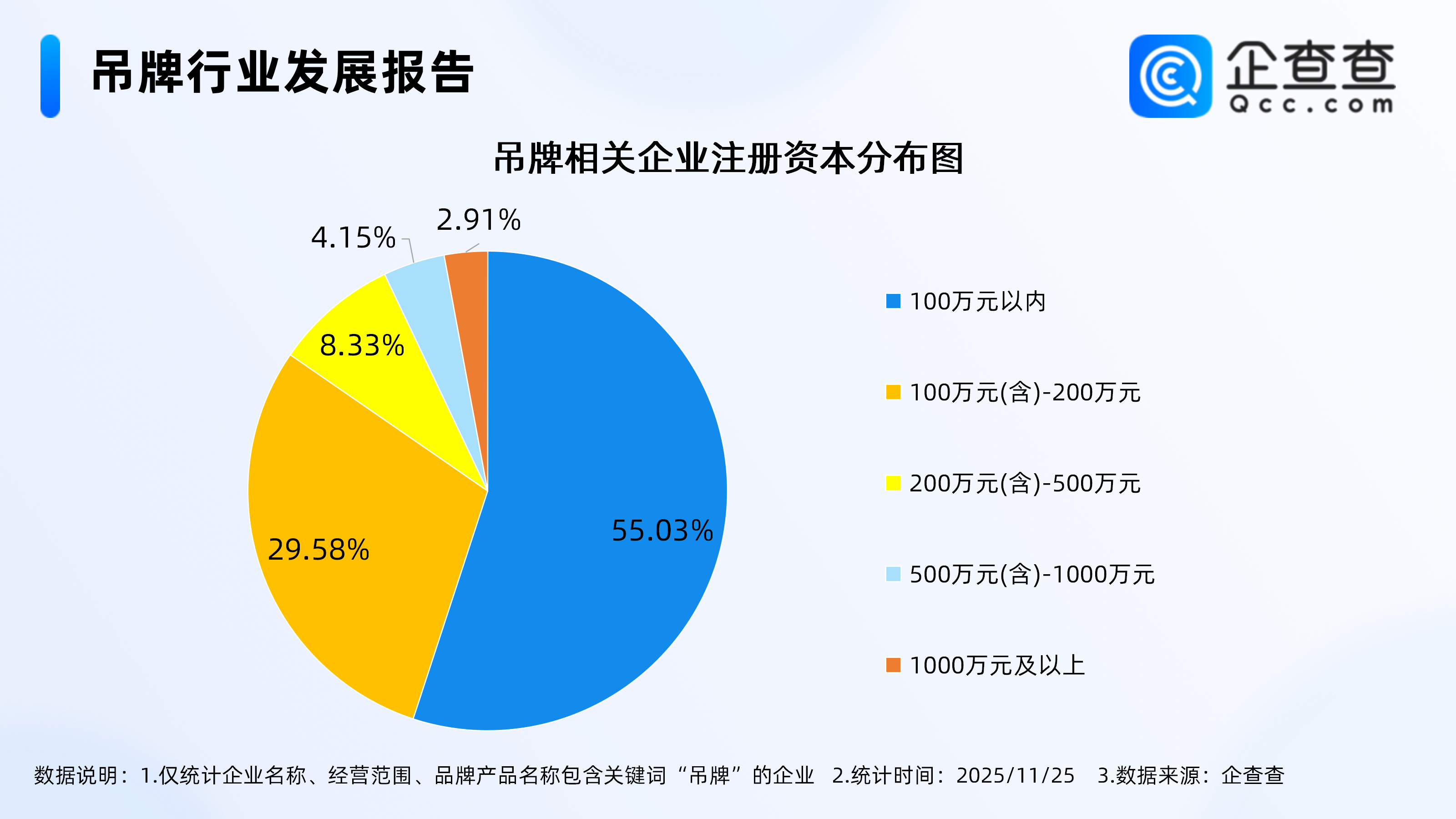 企查查数据显示,截至11月25日,国内现存吊牌相关企业4100家。从经营时间来看,吊牌相关企业多以老牌企业为主,成立年限在5-10年的相关企业占比过半,达51.06%。其次,成立年限在10年以上的相关企业占比达44.35%。2.吊牌相关企业注册资本多以轻量级为主