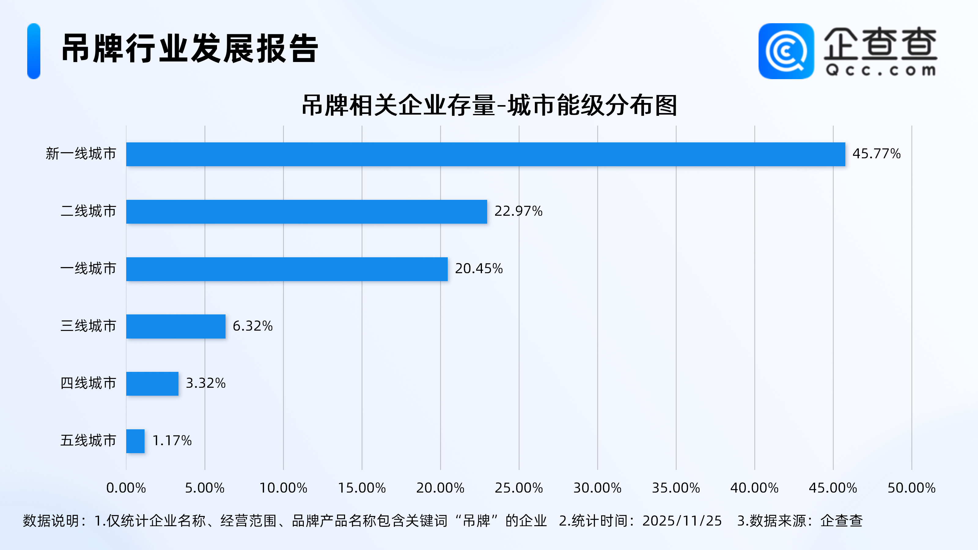企查查数据显示,从城市能级分布来看,吊牌相关企业主要集中分布在新一线城市,占比达45.77%。其次,分布在二线城市、一线城市的吊牌相关企业分别占比22.97%、20.45%。